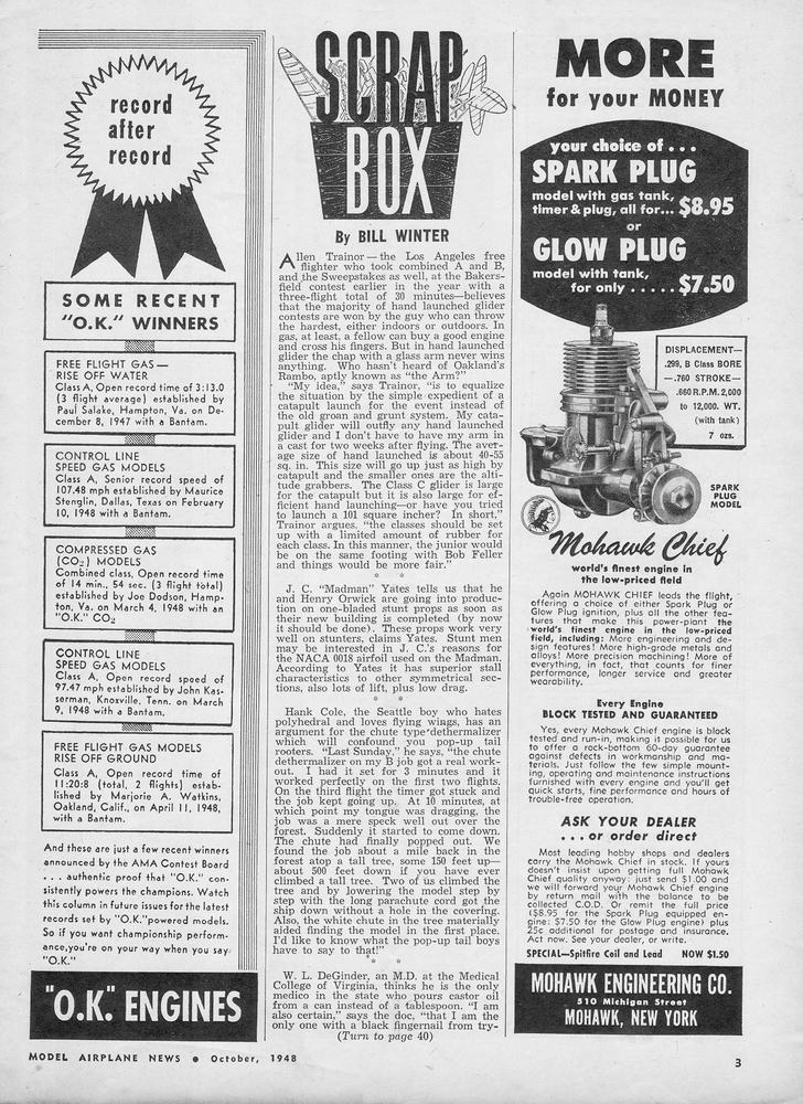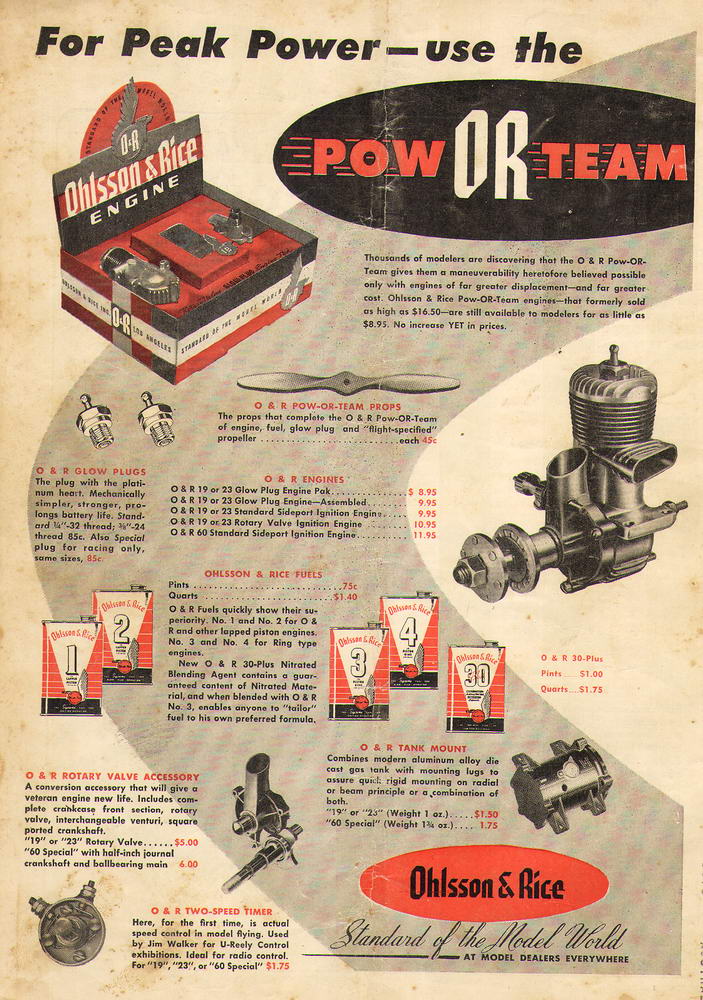 By the end of the year 1948, it was juat about over for the hot-coil. H&H was soldiering on, with small ads that dropped the term "Hot Coil" while claiming they were there first with the "Glow Plug" engine, and were still the leader (in their own eyes). Arden had gone full page and were advertising a new plug utilizing Ray's second glow plug patent featuring replacable hot and cold coil elements, in short and long "reach" versions. OK were advertising their "Hot Head" glow plug engine at $12.50, and shamelessly, on the facing page, their side-door el-cheapo brand, "Mohawk", advertised the Chief as either $8.95 for ignition, or $7.50 for the glow version—almost a buck-half cheaper, and no problem about needing a stronger shaft and rod in a Mohawk, apparently. But the real nail appeared on the back cover where Ohlsson & Rice had gotten in the act with their own design glow-plugs in 1/4-32 and 3/8-24 threads, thus covering both the old sparkie threads. They also offered their .19 and .23 engines as a glow plug version for as little as $8.95, unassembled.