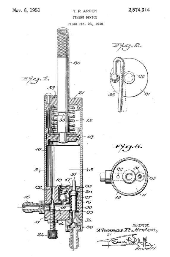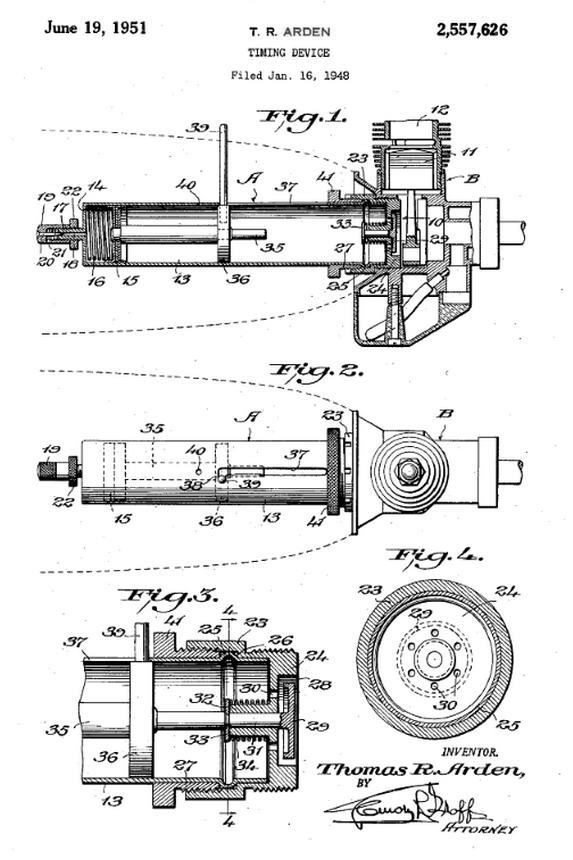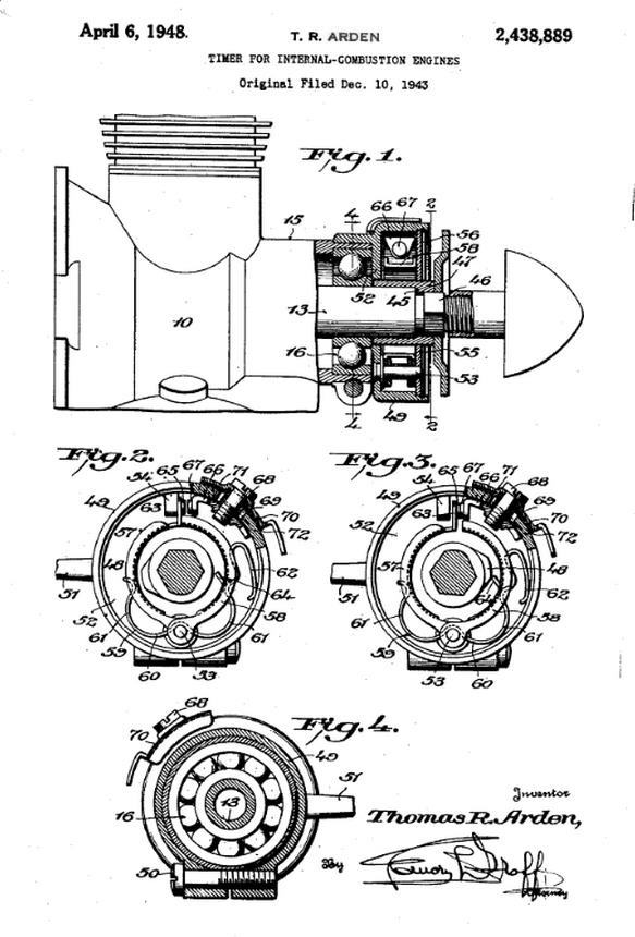 Of the patents shown above, take special note of 2274644 (1939), and 2412195 (1943). These patents, respectively, introduce the ball-joint conrod, and a system providing 360° exhaust with milled internal transfer channels, both later adopted by OK, Cox, and many, many others. By creating a way for a model engine to keep running without on-board coil and batteries, Ray Arden killed of the most popular and practical engine cut-off of the time: break the ignition circuit. Obviously recognizing this, he patented two devices for stopping glow plug engines. The devices are shown in patents 2557626, and 2574314, both filed in 1948. Both of these display remarkable ingenuity and complexity in addressing a relatively simple problem.