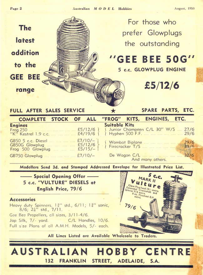 In Australia, distribution of the 'K' engines was handled by Bill Evans, who also had an exclusive on distribution of the Gee Bee engines being made by a young Gordon Burford. Evans contracted Burford to handle servicing for the K engines, which resulted in a stack of jigs and fixtures being sent to him from England. In later years, Gordon told David Owen that this was a great boost to him as a start-up model engine maker and ideas from those jigs were adapted into some of the tooling for his later Sabre and Taipan designs.