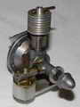 Majesco Motors of Parkstone in Dorset was one of the earliest companies in England to commence post-war manufacture of model engines with a side-port petrol engine of 4.5cc capacity in 1946. This was followed by a number of 2.2cc diesels made using the same crankcase casting. The engine seen here is the 1948 Majesco Mite, a 0.735cc diesel made, according to Fisher, in very small numbers (p31). It featured an front rotary shaft induction with an unusual side mounted venturi and fuel tank.