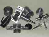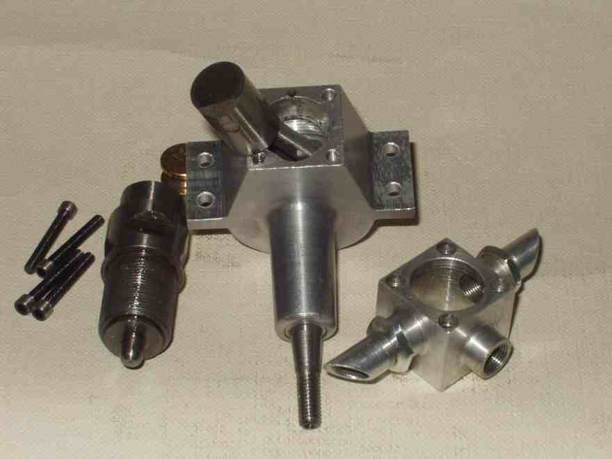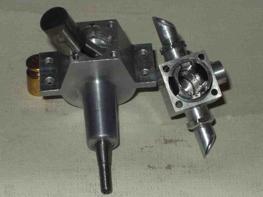 The cooling head and compression adjustment is machined from alloy bar material with a very fine thread internally to match the cylinder liner (this is a superb fit). The top has a machined hex for adjusting the compression and a guide hole for the spigot of the contra piston. As mentioned earlier, this is of unusual construction being a sandwich of mild steel with a lead alloy centre filling. This is intended to expand when warm and lock the contra piston! The guide spigot is required because the contra piston protrudes from the top of the liner and needs support.