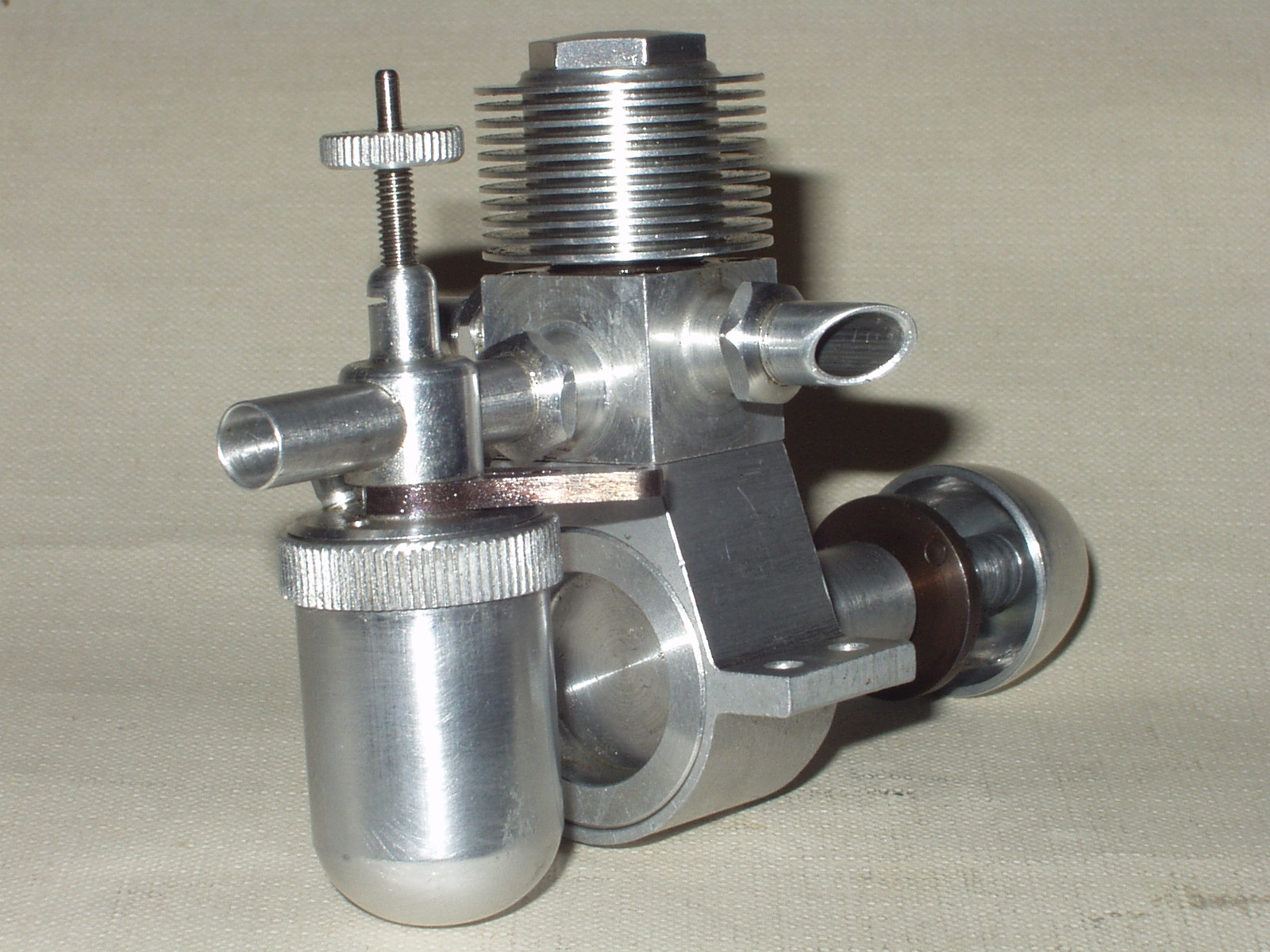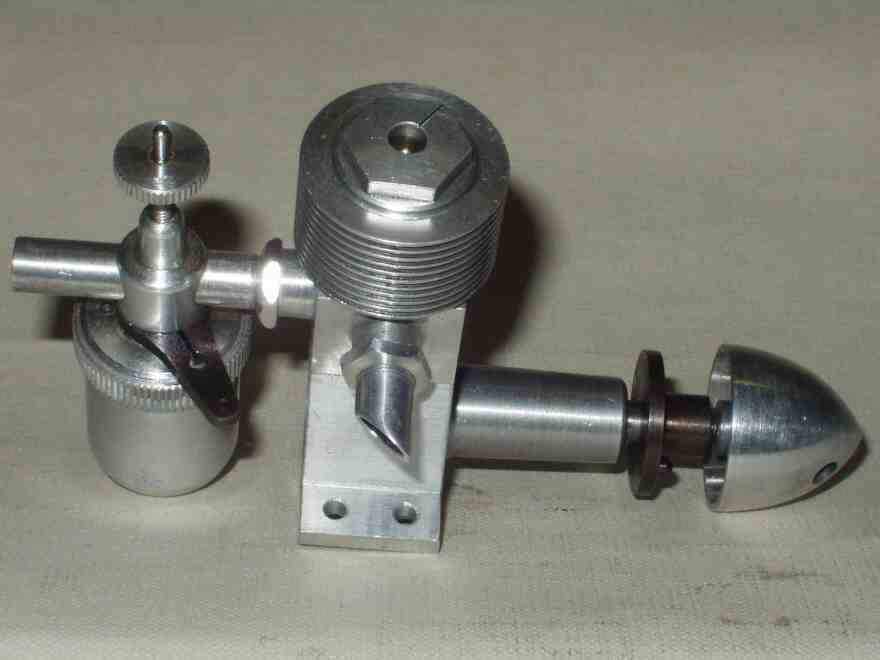 The fuel tank and venturi/needle assembly is also of superb quality. The faults are intrinsic to the design in so far that the transfer passage seal is marginal and the composite contra-piston with the spanner operated compression adjustment is inconvenient and rather poor. Add to this, the prop driver clearance would certainly cause rubbing of the crankpin on the back plate and introduce metal particles into the cylinder. These faults could have been easily remedied if the liner had had a square flange at the top and a conventional contra-piston with an adjusting screw were fitted. The prop driver would be easily fixed by better fitting of the taper to take up the excessive end-play.