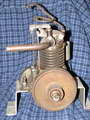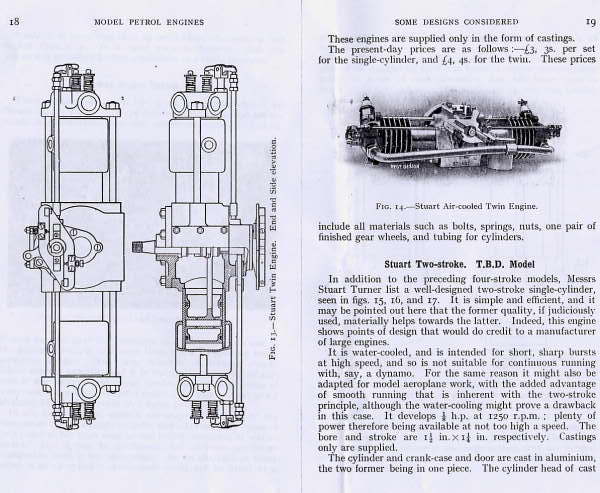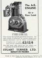 Stuart Turner Ltd (UK) was established in 1898. This makes them one of, if not the oldest model engineering kit manafacturer still in existence. Now known as Stuart Models, they remain respected for their well designed, high quality live steam model kits, but in times past, they also marketed a range of Internal Combustion engines in kit and finished form. These were large engines, intended to be capable of driving workshop equipment at a time when many model engineers' lathes were treadle (ie, foot) powered. The 29cc Stuart AE seen here first appeared around 1926. Note the stationary steam engine influence in the cast base shown in the Stuart Turner advertisement from a 1939 issue of the Model Engineer. CF Caunter's 1939 book, Model Petrol Engines, shows a horizontally opposed, air-cooled Stuart AE IC engine. The 1922 edition of his book says they offered four models. These were earlier air and water cooled versions of both the single cylinder and twin cylinder engines. The text notes that that the single was introduced by them in 1911/12. The book also makes mention of a Stuart T.B.D. two-stroke model.See also: Stuart steam engines