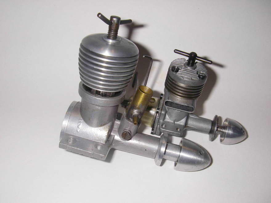 Bore and stroke of this motor are 15.6mm x 18.0mm, giving a capacity of 3.44 cc. For purposes of comparison, the last photo above shows the WAF-3.5 posed beside a 1cc ED Bee Mk II which gives a good indication of its gigantic size. The long stroke of the WAF results in the engine being unusually tall for its capacity, just like the WAF-1, a factor which gives it a rather old-fashioned appearance and may have told against it in potential sales terms. At 213 gm (about 7.25 oz), it is a bit porky in terms of weight, much of which is in the very heavy cylinder. However, it runs very strongly and is easy to start, as is reported for the 1cc model.