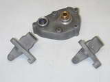 This shot shows the timer casting, marked out, ready for machining, with the gear case cover and cam shaft bush the timer will attach to. The timer castings have been fettled and blasted as described in Page 8 of this series, then marked out for boring. Forget the location of the cast spiggot on the frame (as usual). Measure down from the underside of the horizontal arm, then center-pop equidistant from the sides of the frame in the clamp area.