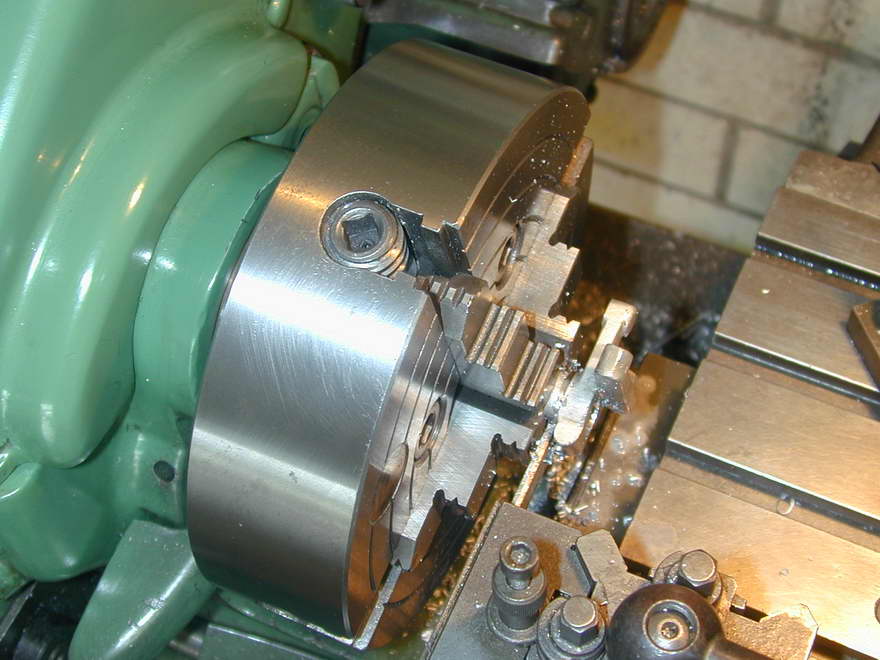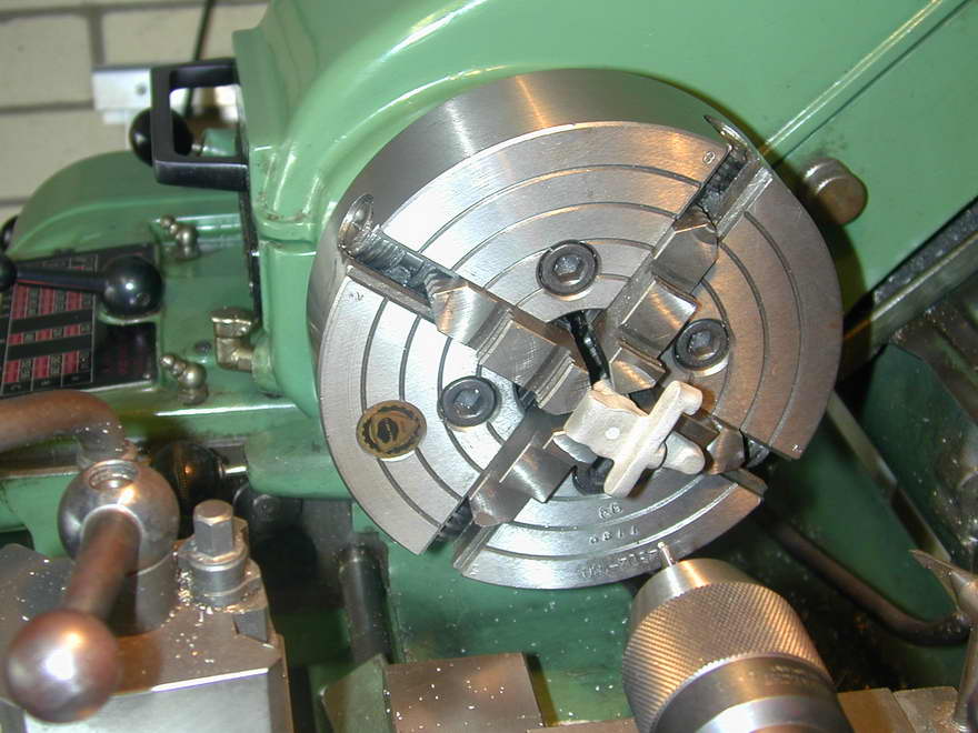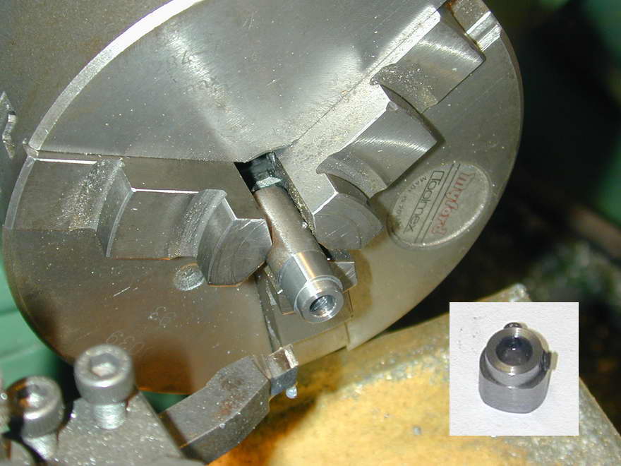 The last job is the contact breaker cam. I really did not like Westbury's taper pin attachment idea; it's just too permanent (and I don't have a stock of taper pins and taper pin reamers, though a model engineer with a live steam background may have). The alternate is to secure the cam with a hex head grub (set) screw. Experience shows that a single set screw will ultimately come loose, even when cinched within an inch of destroying the hex socket, while two such screws positioned at 90° to each other will hold forever with only moderate tightening. The cam flat could be filed, but I've chosen to turn it using the old out-of-phase 3-jaw chuck assembly bodge. This is described in the Sugden crankshaft page and gave the desired result with very little effort.