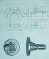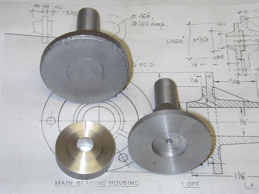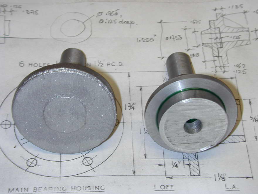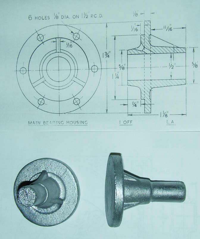 Logically, the next part to make would be the crankshaft. Following the established philosophy of making things that other things fit into first, we must begin by machining the front bearing housing and its bushings. At this point, the first serious problem with the Hemingway parts emerges: seems an over-zealous individual at the foundry has circumcised the nose casting! Maybe they thought they were being helpful in removing what they took to be a casting sprue, except it wasn't—it was an essential part of the casting. Notice that the rear of the casting is flat, while it should have a protrusion that supports the aft crankshaft bushing as seen on the plan underneath it.