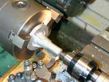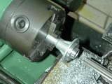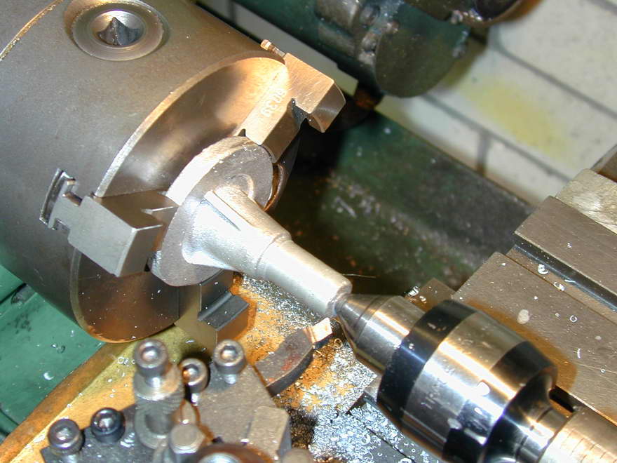 Preparation for the repair comprised gripping the casting on the rough flange so that the chucking piece could be trued up. This required the infrequently used "outside" jaws for the self-centering chuck, and a spot of tailstock support after the casting had been tapped about to get the point where the end would eventually be running kind of true. The part was then gripped on the chucking piece (duh) for facing and counterboring. The fixup is turned to a Loctite fit in the counterbore and glued in place as seen above.