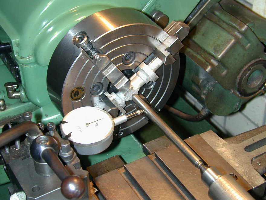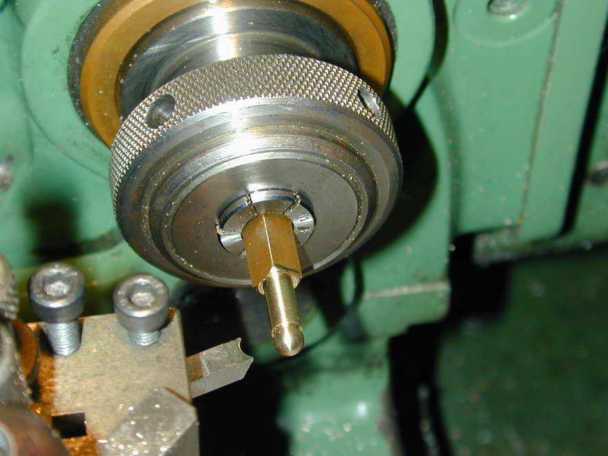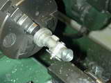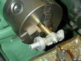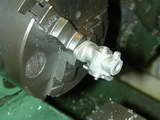 The problem is rather cosmetic in nature, and hard to see when assembled, but I chose to mount the casting on a stub mandrel and clean up the bottom of the casting so that the boss appeared concentric with the tapped hole. The mandrel is the brass stock supplied for the throttle barrel. I've skipped showing the machining of this part; it's too simple. But note that is will be bored in situ with the main casting in a later step.