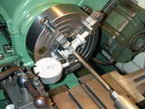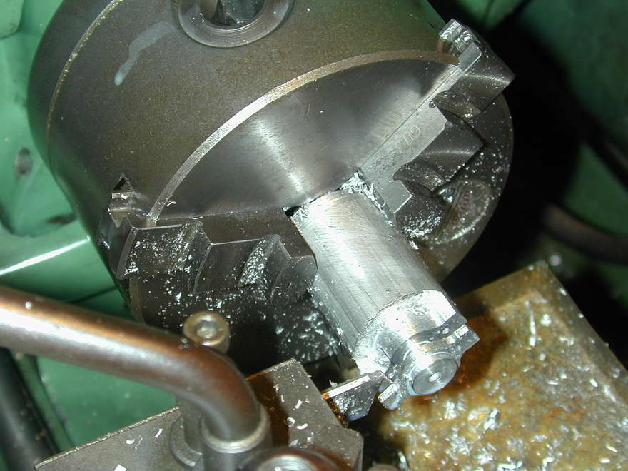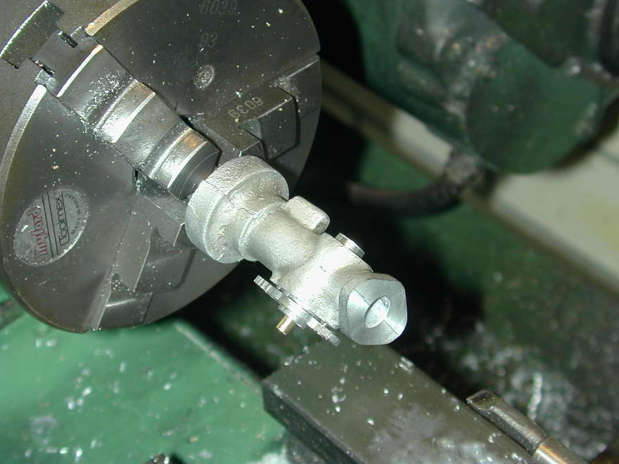 As you can't help noticing in the above picture, the exit of the inlet hole is very badly off-center in the casting, although well centered in the flange end of the casting. I strongly recommend that before anything else, the casting be gripped in the 4-jaw chuck so the entire end can be machined into a chucking stub that is concentric with the inlet tube of the casting.