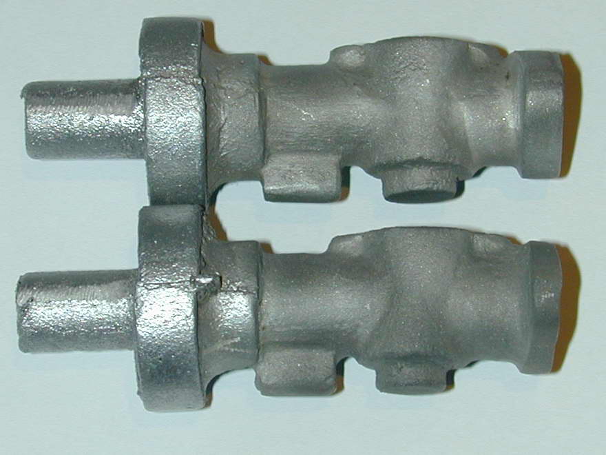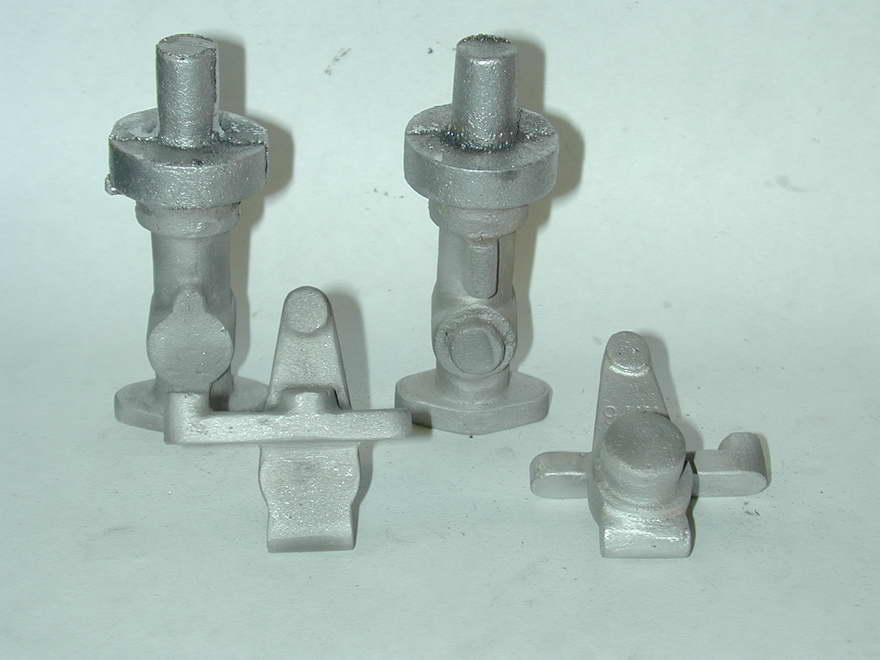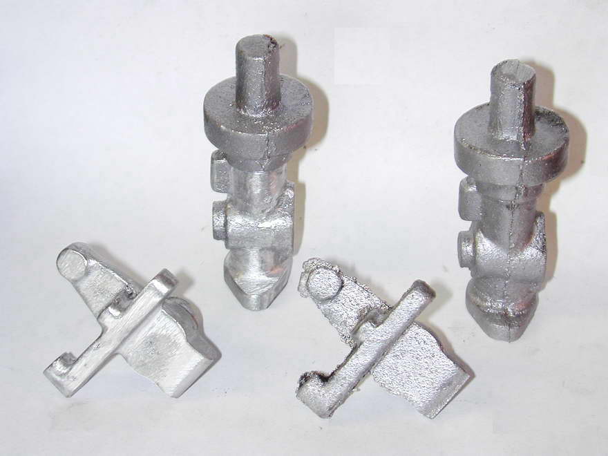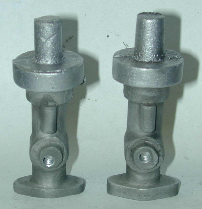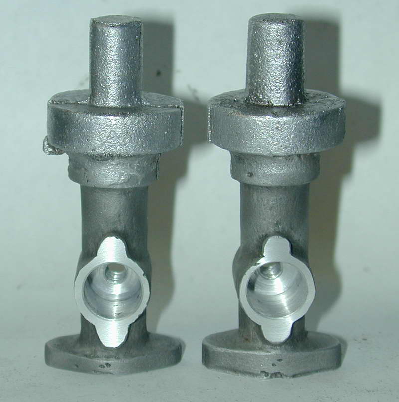 The main casting for the carby is, shall we say, a bit rough, as is the timer casting. So expect to spend an hour with riffler files and maybe a Dremel ® hand-piece making it more carby like and less blob shaped. These shots gives an idea of the before and after state. The first shows a raw casting (right) and one that has been fettled. File work like this can be hidden easily with a spot of sand blasting, or less easily by pounding on it with the bristles of a wire brush, or "file card". The second shot shows the castings after sand blasting.