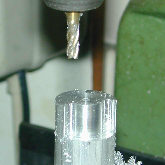 For the next operation, the barrel is clamped into the casting with the cover plate using a washer interspersed between the two to press it firmly to the bottom of the bore. The casting is then chucked by the cast stub and adjusted in position until the bore is centred on the flange axis intersection. This induced an off-center exit for the bore which may have been avoided if I'd used a four-jaw chuck instead. The assembly was then blind drilled 1/4" for sufficient depth to exit the casting when parted off. The mounting flange was next faced back to 1/8" thick (a bit less in the case of the "thin" one). A light witness mark was then made with a 5/16" slot drill on the finished face and the opening taper turned 20° until the taper just met the witness mark.
