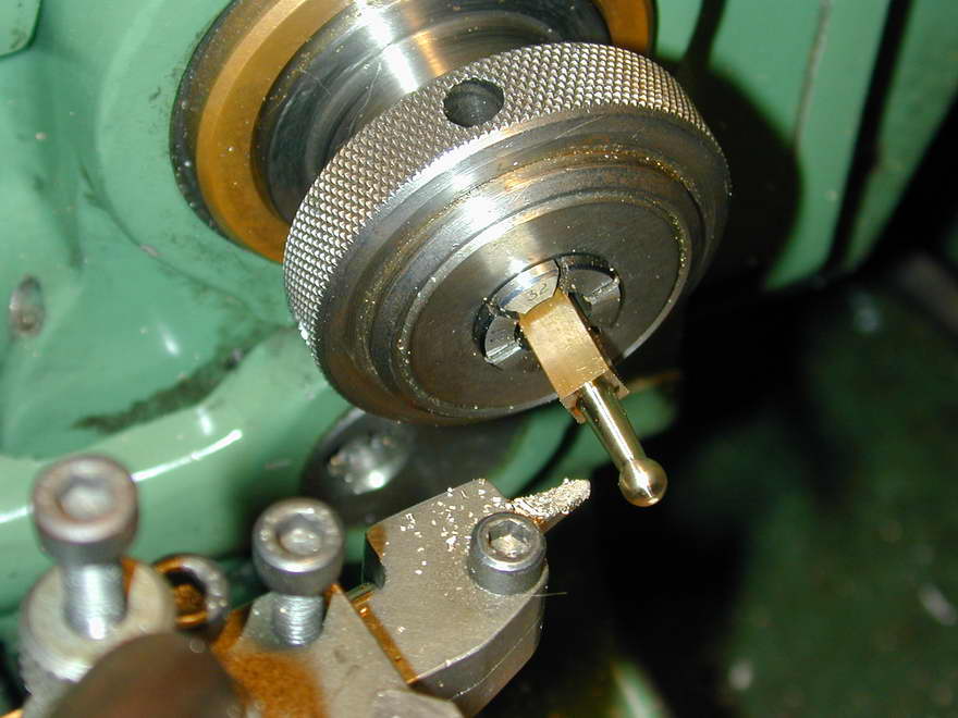 The throttle arm is simple turning and drilling. The photos show wilful abuse of a perfectly good collet to hold square stock centrally for forming the ball-end and taper turning the arm. As the cuts are light, I think this rather bodgie mounting is acceptable; saves grunting the four-jaw chuck from the bottom drawer. The end was formed with a form tool ground off-hand in HSS with a chain-saw sharpening stone in a Dremel tool, using a drill shank to check size and shape.