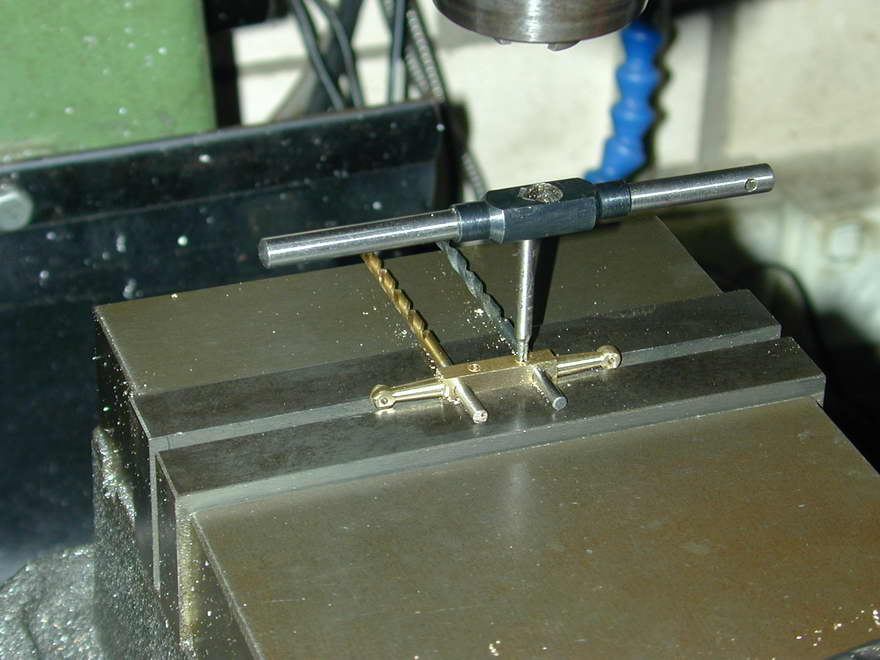 The remaining parts for the carby are simple turning, drilling and tapping. I've chosen to make the parts per the drawings, so the fuel line will be solid pipework, secured by a gland-nut. A special stub pipe and ferrule can always be made to attach a conventional plastic tube for testing purposes. The gland nut on the other end is packed with Teflon tape (plumbers' tape) to provide a seal around the needle thread. Note too the fine "compensating" hole in the bottom of the inlet "T". For the life of me I can't see why this is not going to leak fuel, but I've drilled it anyway. Worst comes to worse, it can always be invisibly soldered over.
