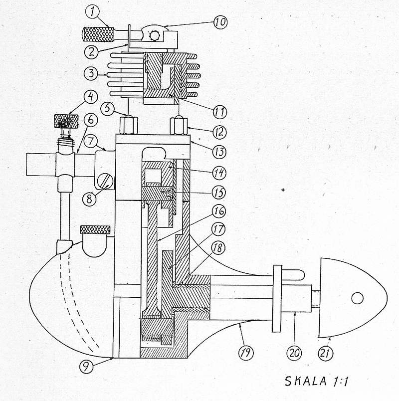 The fuel consists of 60% kerosene, gasoline or petroleum spirit, 15% paraffin oil, 15% auto oil and 10% ether. The tank is filled with fuel, the needle valve is opened a couple of turns and the crankshaft is turned over a couple of times while the air inlet is covered with a finger. After this, the engine is started. If it does not fire, the compression setting is increased until it starts. Be careful at the outset and make only short test runs. When the engine is broken in, the paraffin oil and the engine oil can be reduced somewhat. This engine reaches 7,500 rpm and yields 1/10 HP.