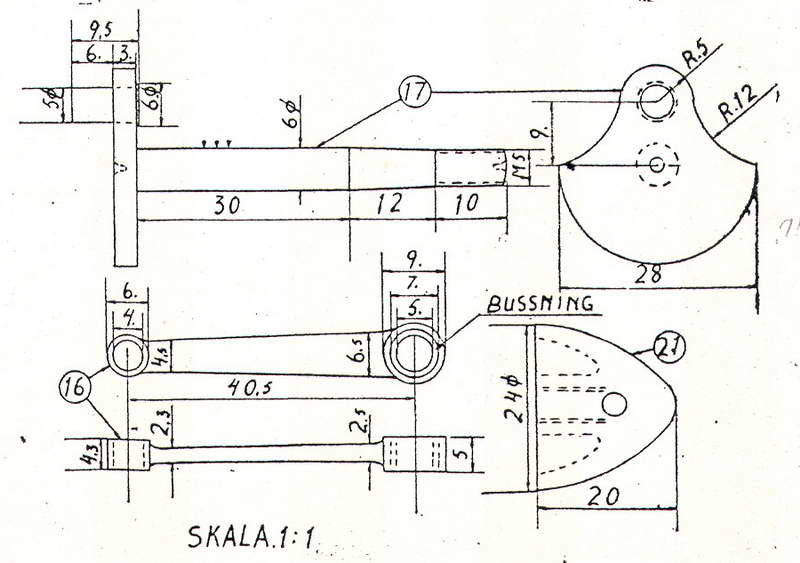 Part 17, crankshaft, is turned from steel. A 3/10 mm allowance is added for grinding. The web for the crank pin is blue-tempered and the hardened steel crankpin is pressed in. The crank shaft is then ground to size.