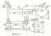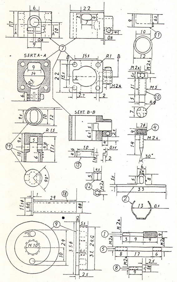 Part 16, connecting rod, is made from steel, hardened and tempered. The lower part is tempered blue and the bushing (which should be made of Nika or phosphor bronze) is pressed in.