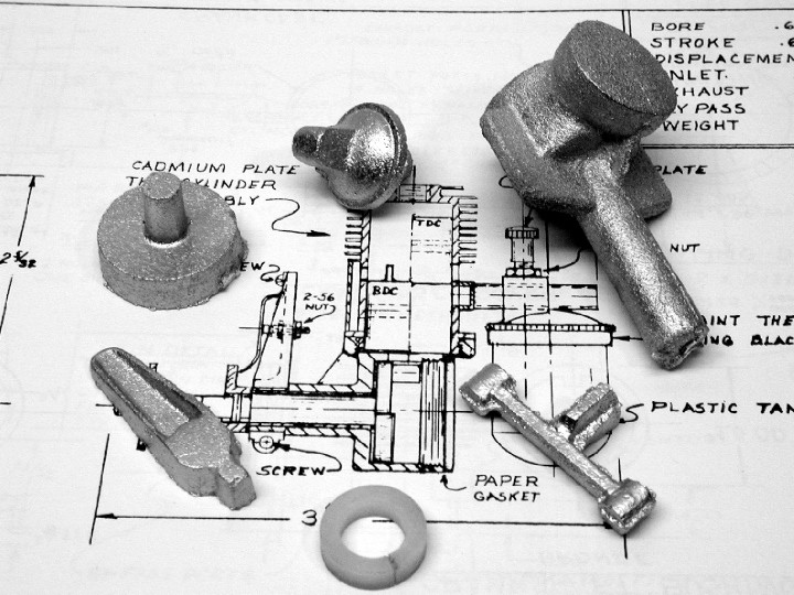 The kit provides aluminum castings for the crankcase, front cover, connecting rod, timer, tank and tank top. Detailed CAD drawings and step by step instructions are included