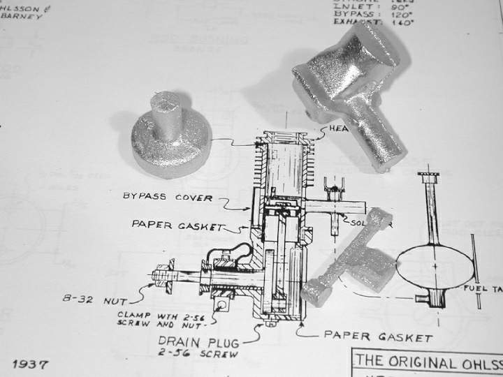 Irwin Ohlsson designed and built his first engine in 1934 with the help of his friend Roland Barney. Two engines were built, one for upright operation and the other for inverted. This .12 cu. in. casting kit reproduces the upright model and uses modern port sizing and timing to run better. The piston design has also been simplified. The kit has rough aluminum castings for the crankcase, the back plate and the connecting rod. Complete plans and machining instructions are provided.