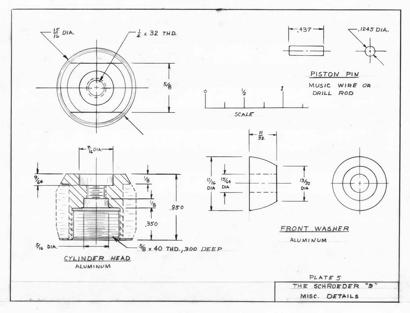 The cyl1nder head is also the cylinder cooling fins. Start making the head by boring and cutting the 5/8 x 40 threads .30" deep. Provide a relief at the end of the thread up to the .350" depth shown. The head gasket will occupy part of this relief area. Bore the 5/16" diameter cavity to a depth of 1/8". This cavity provides clearance for the V-2 spark plug electrodes. Do not drill and tap the spark plug threads at this time.