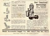 Bowden's book does however lead us to another engine, stating that the 2.8cc "Buzzard" was designed for Masco by Sparey and Russell. The December 1949 issue of Model Cars carries another Model Accessories Supply Company advertisement for the Sparey 5cc and .8cc(sic) casting sets and announces this "sensational" new design by Sparey and Russell, adding that it is "[the] only engine covered by the all embracing master patent No. 593551. Original prototype application dated 4th June, 1945."