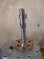 Positioning and pivoting the grinding wheel can be accomplished by a sleeve the slides on a rod which must be perfectly parallel to the other two shafts. Some means also must be provided to dress the wheel in situ and to adjust the height of the wheel from the work, preferably with some calibrated means to adjust it. In this photo of a machine designed by Eugene Croll taken at the 2005 GEARS exhibition, the wheel head is shown rocked back providing access to the shaft for inspection and measurement.