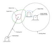 The most common published design has three parallel shafts. Two are mechanically inter-linked so that they can be rotated in the same direction in a 1:1 ratio. This connection can be any non-slip means and I've seen chains, gears, and toothed drive belts used. The master cam is positionable along the first. The second is the generated cam, or rather a carrier for it. The grinding wheel is mounted on a rocking arm that pivots on the third. It too can be repositioned and locked over the cam locations. A follower attached the arm rests on the master cam. The moment arms provide the scale-down factor from master to generated cams. The inter-connected shafts need to be rotated at a relatively slow but steady rate. I've seen hand-cranked machines and various automated drives provided by windscreen wiper motors, electric car window drives, messes of gears, and more recently, stepper motors ratted from old printers. The picture here shows a conceptual layout along the lines described.