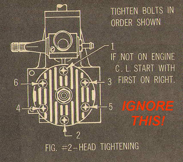 On this page you'll read a strategy for tightening the head bolts on model engines which have such things. It came about after I saw a diagram in a respected magazine suggesting a sequence for tightening the bolts on a typical six-bolt head. The sequence initially struck as wrong, until I realized they were talking about one style of engine, while I was thinking of another. But the unwary could apply one to the other and cause a distortion that the sequence was intended to prevent! Clearly what is required is that model engine owners understand the problem, then be able to work out the most appropriate sequence to avoid distortion, or poor seating.