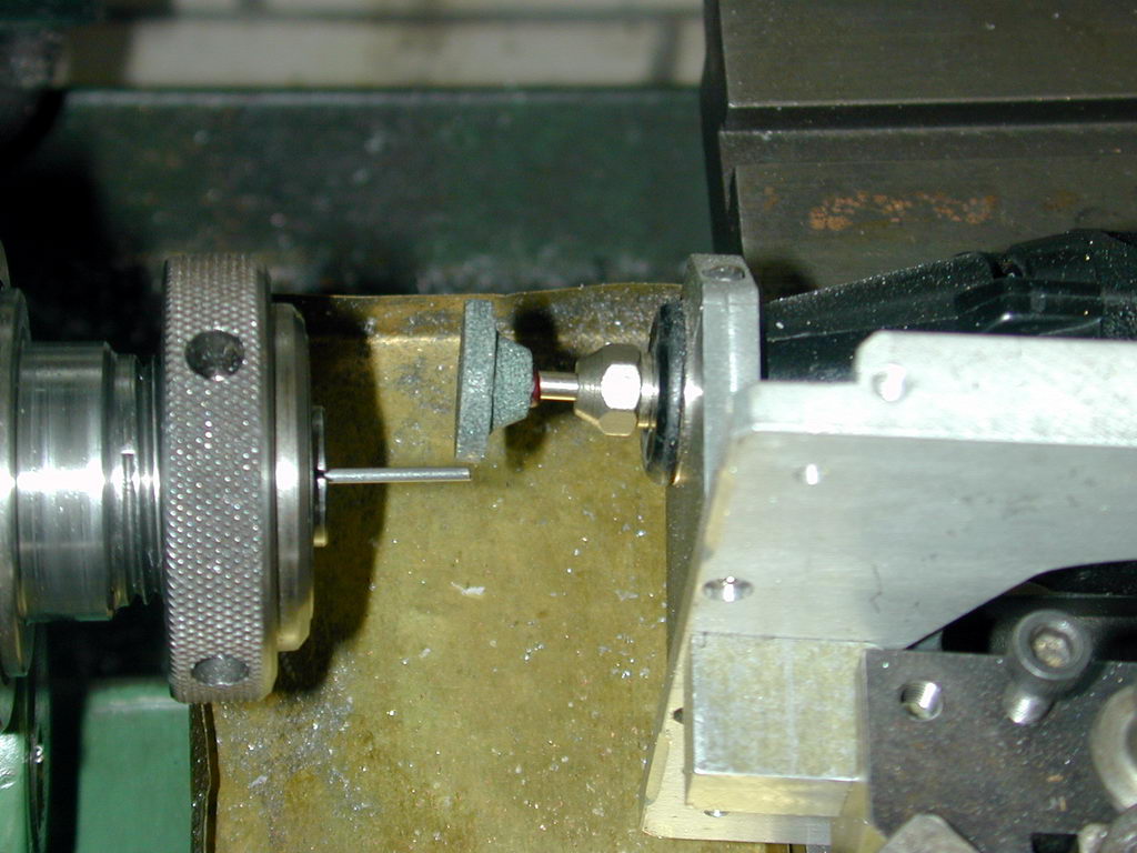 The needle is ground into the tip of a piece of suitable music wire (1/16" is the must universal choice) by setting over the compound slide by 4 to 5 degrees. This shot, taken from the back of the lathe looking towards the operator shows the tool ready for use. The stock is held in a collet to provide optimum concentricity. If the wire is not spinning on the axis of the lathe, the point will not be concentric with the wire and the needle will either leak at the closed position, and/or cause adverse wear in the seat.