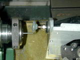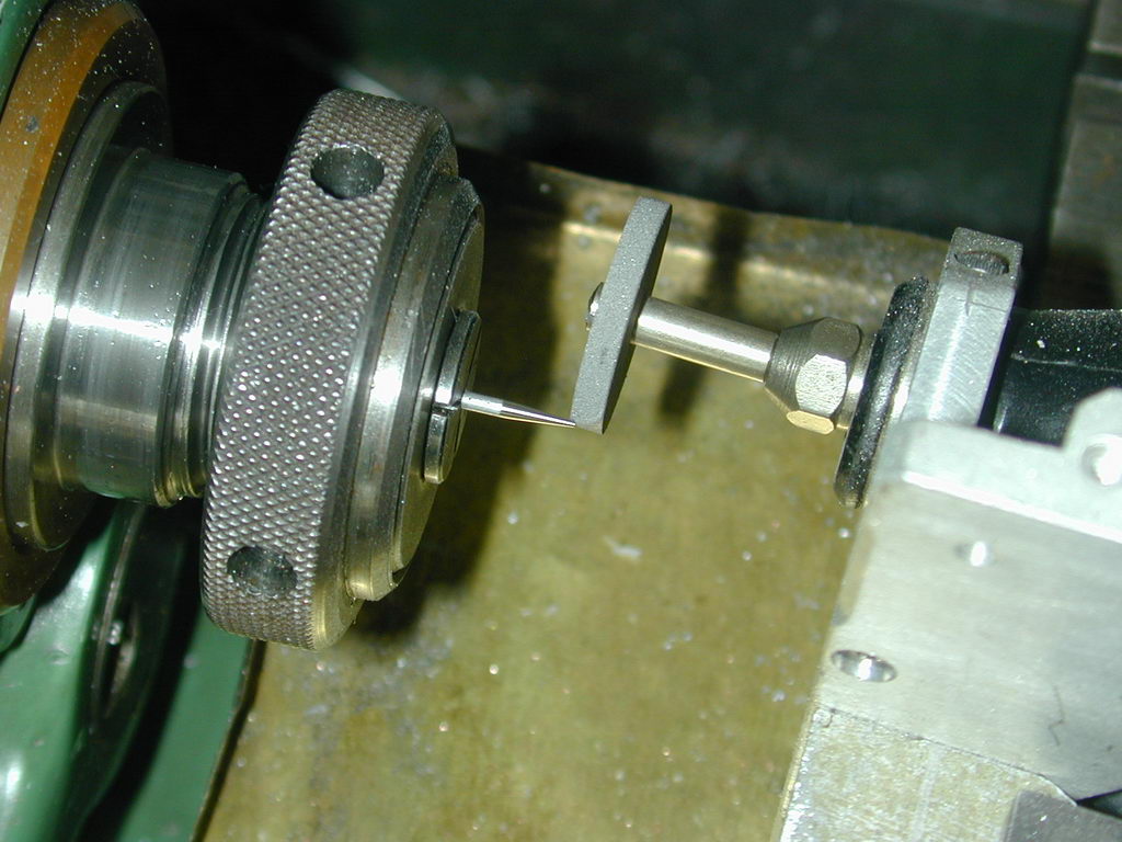 The Wire is gripped with minimum overhang and the lathe set to run at maximum speed. Normal rotations would be such that the relative surface speeds subtract, so the lathe will have to be run backwards. If you can't do this, run at the slowest possible forward speed. In this shot, a Dremel #85422 Silicon Carbide disk 25/32" in diameter (19.8mm) is being used. These stones give a better surface finish than the aluminium oxide equivalent (part# 8215), but neither are good enough for the finish required, merely for roughing down. Note that the wheel is set to cut at the rear of the work. This minimises the degree to which the job is obscured by the wheel. Take light cuts, running the wheel over the work several times at the same cross-slide setting until the job no longer sparks. Then advance by 0.001" and repeat until the end is approacking a point. Points are not bad, just unnecessary--you're not going to sew with it--it just needs to be smaller than the needle seat hole.