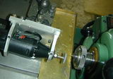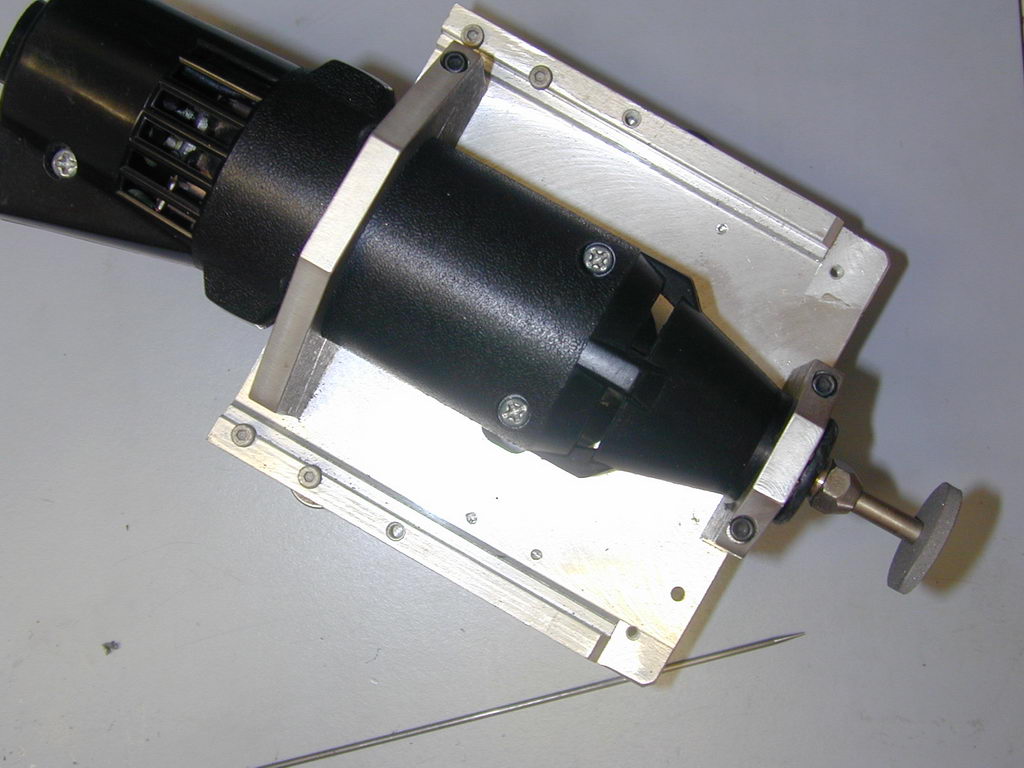 The tooling is based on the now inexpensive high-speed hand tools made by Drelmel (R) and others. A special holder is required to clamp the tool roughly on the lathe axis so it can be used as a tool-post grinder. The Dremel's bearings are not good enough to use it as a tool-post grinder capable of grinding crankshafts and cylinders, but with a little work, it will do a more than adequate job on needles. In this photo, two clamps made from 1/4" thick aluminium plate are bolted to an old dead disk drive plate to hold the tool. A bar on the underside of the plate allows it to be quickly mounted in my lathe's quick-change tool post. With the bar removed, this jig is also used in conjunction with a guide and table assembly to slice up carbon fibre sheet for free-flight wing spars.