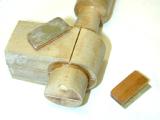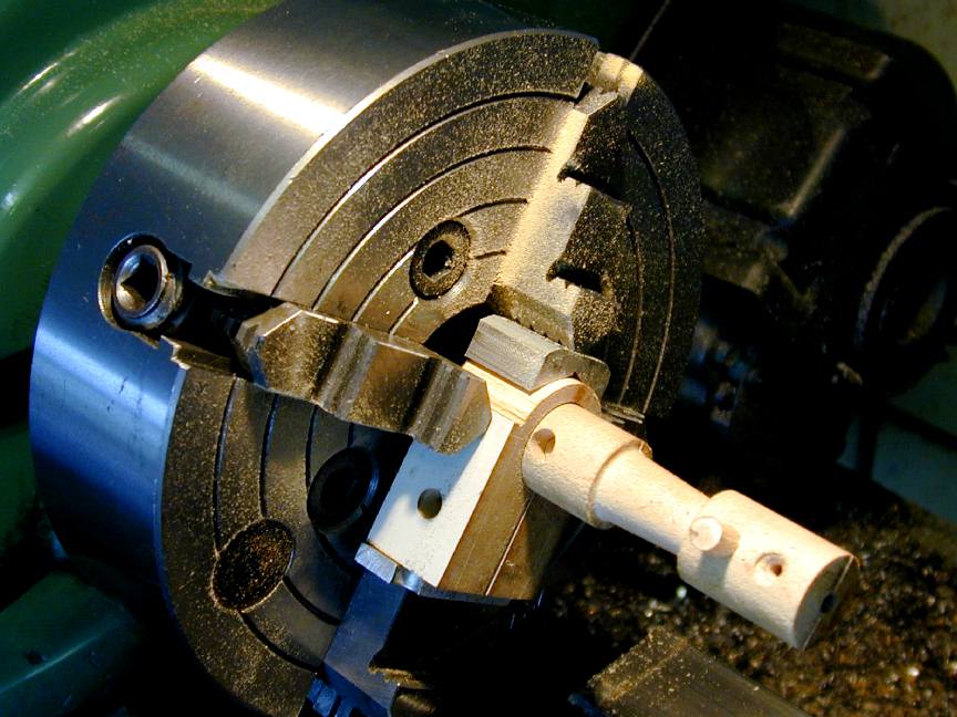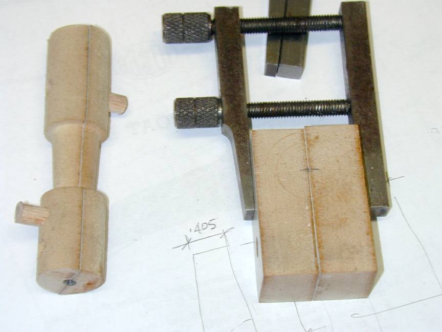 This photo shows the turned case journal, chucking stub and rear projection (explained in the last paragraph), together with two more blocks of craft-wood, doweled together at one end only, ready to be drilled out to take the round bit at the other end--hence the lack of a dowel there. The block has had the horizontal center line clearly and cleanly scribed, then using this as a center, scribed for the hole (which will be bored in the lathe to ensure it is exactly centered on the join line) and the case outside diameter (with only 0.01" machining allowance this time). As the wood will be quite delicate after the hole is drilled, I chose to cut almost to the finished lower case diameter before hand.