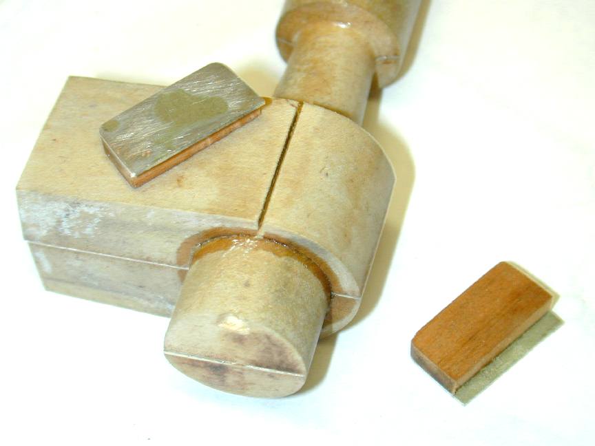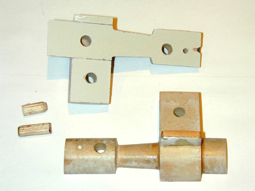The last step is attaching the lugs. Having had, heard, and seen problems with this simple job before where the wooden lugs have subsequently warped and made extracting the pattern from the sand difficult, I hit on the idea of keying them into the main pattern with aluminium tongues. A junior hacksaw blade cuts about 0.020" thick. Some scrap 0.020" aluminium was laminated to some 1/8" thick spruce, and cut to lug shape. The ally provides the shrinkage and machining allowance, and a slight draft is sanded onto the wood (which will be positioned at the top) to provide a little draft. The sawcut is made on the scribed centerline along the case axis. This ensures the bottom of the lugs are in about the right place. Finally, the lugs are glued in place (cyno-acrylate) and a fillet formed at the upper juncture with cellulose balsa cement.