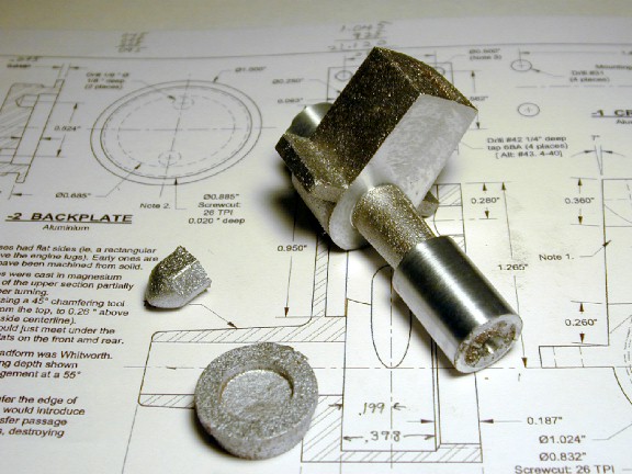 We need to provide for one or two allowances. If some part is to be considered as being at the finished size as cast, it needs only an allowance for alloy shrinkage during cooling. The rule of thumb for aluminium is 5/32" to 3/16" per foot [1]. If the part is also to be machined, an extra allowance is required for this, and that can be as big as you want. Unfortunately, my plan calls for an either/or, so I decided on roughly 1/64" (between 0.016" and 0.02") for machining. On top of this we need the shrinkage allowance which can easily be calculated by multiplied the dimension by 1.014. For example, say we wanted something to be 0.75" diameter when machined. The pattern would need to be 1.014 * (0.75 + 0.04), which is 0.801"--call it .8" as close enough for government work.Lathe Abuse for Beginners