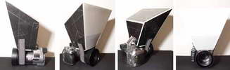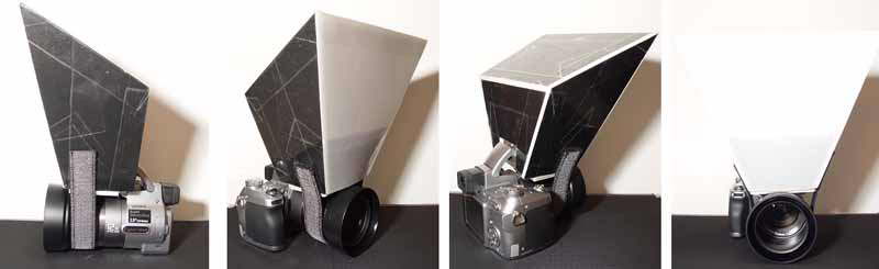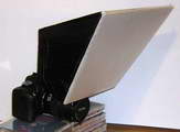 My method is easy to use, but you need to make a simple bit of kit called a Softbox. This is just held in front of the on-camera flash and its purpose is to spread the light. I have attached a picture of the one I made; its sides are cut from white foam board bought at an office suppliers, stuck together with black duck tape [duct tape?]. The front is some semi-opaque Correx that I had left from another job. It could just as easily be some light, white tissue paper or frosted plastic of some kind. I just hold mine in front of the built-in flash on the camera with a velcro strap around the lense body. The result is flash illumination with very soft shadows. It takes about half an hour to make, then you have it for good, or until sat on. Notice that it has no parallel sides. The idea of the odd shape is for light to bounce all around the white inside of the box and to come out of the large front, fully diffused and at all angles. By contrast a bare flash gun gives a point source and harsh shadows.