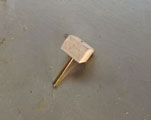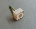 As you should guess, the wire holds the washer. It does this by protruding through the block by just under the thickness of the washer. The hole in the block has been drilled using a drill-press job as it really needs to be at right-angles to the face of the block if the jig is to work correctly and not tend to spit out the washer. In the shots here was see the tiny projection of the wire, and a washer fitted to the jig so that the "top" face will be downwards (compare this face to the burred face of the washer next to it).