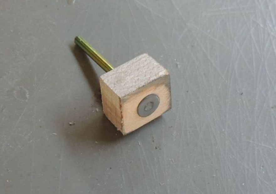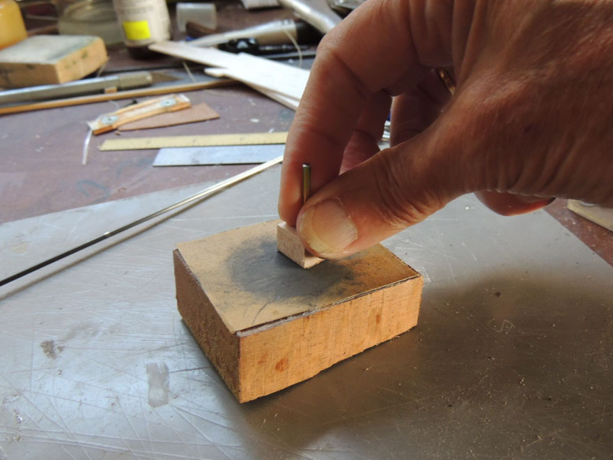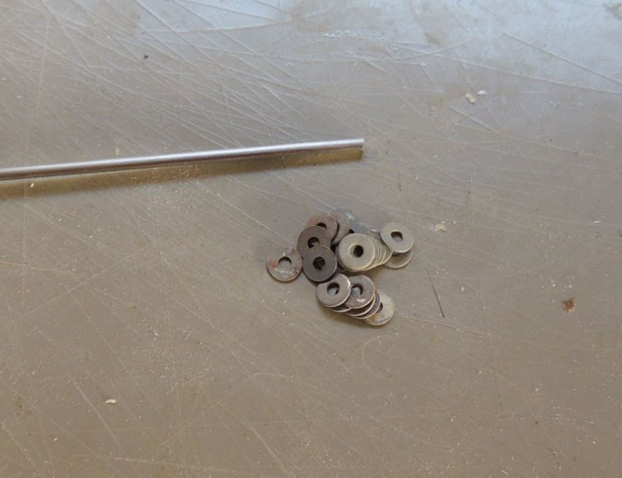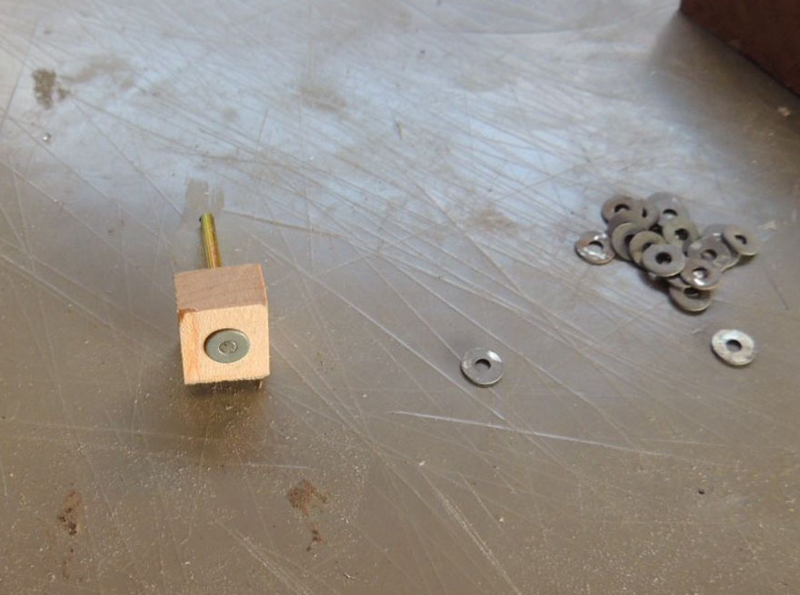 For that, we will use a simple jig comprising a small block of hardwood with a piece of 3/32" piano wire firmly inserted in it. Note the two washers. Because they have been formed by stamping, one side will have a light, raised, sharp burr edge; the other will be slightly rounded. Let's call this side the top. It is far easier to clean the top (rounded) side than the other as that would require first removing the edge burr before you can get near the surface.
