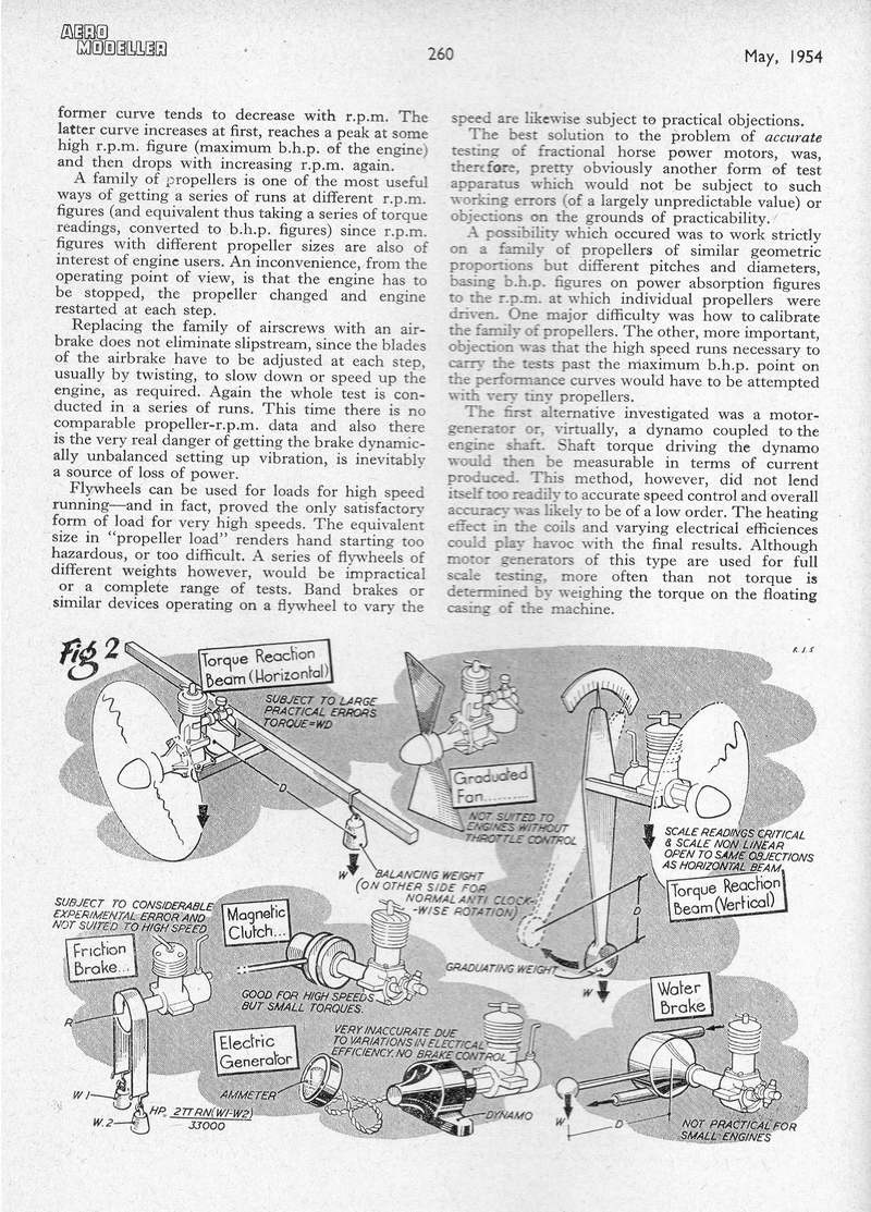 This drawing appeared in the Aeromodeller of May, 1954, and does a good job of illustrating the various means available to us for measuring the torque of a model engine. It was included in an article that described their recently introduced Eddy-current Dynamometer (noticeably absent in the illustrations) and marked a change of the guard in engine testing at Aeromodeller as Ron Warring took over from Lawerence Sparey.