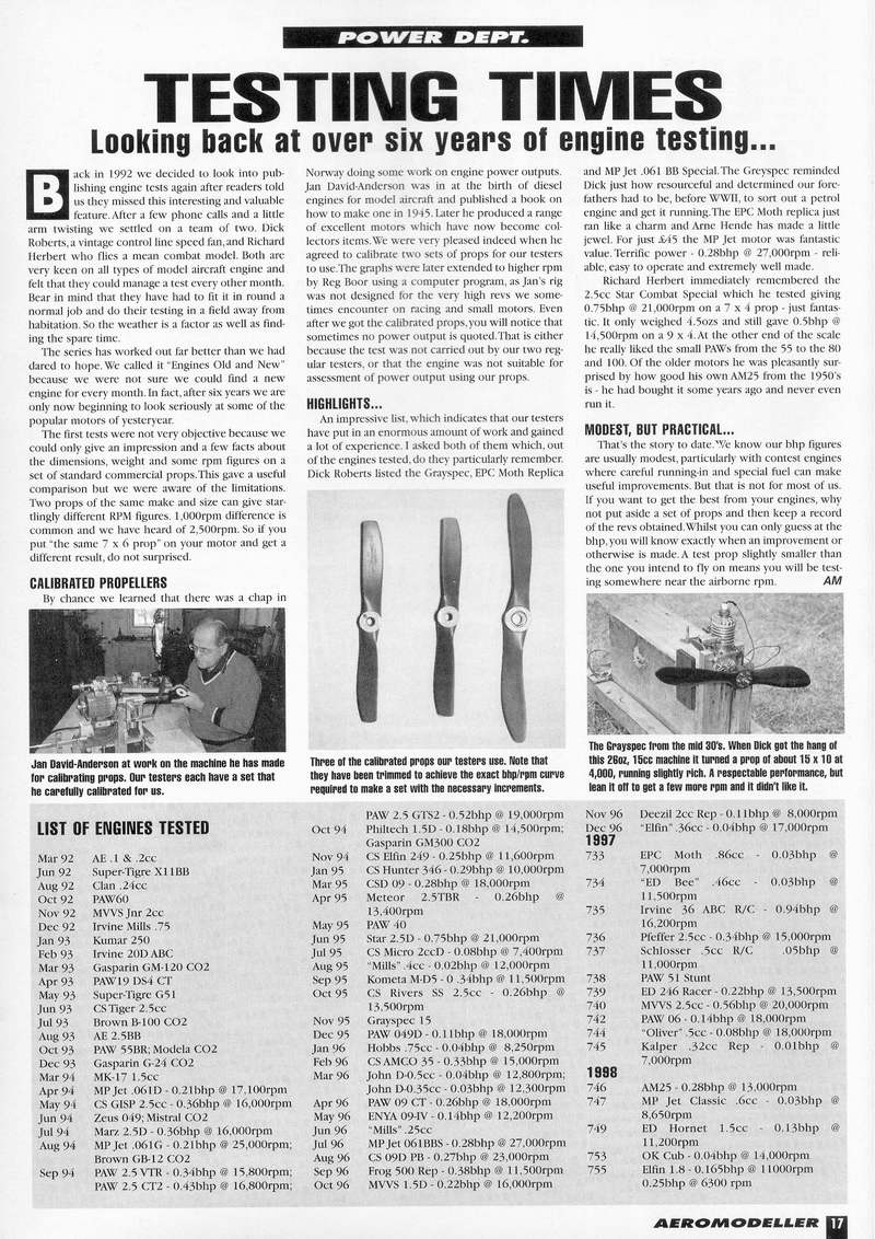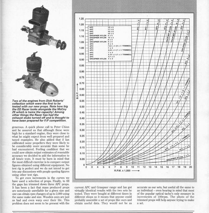 The answer is to derive your own numbers for your own chosen props. This also permits you to trim a prop to modify its power absorption curve so as to achieve a more evenly spread set of props (see the spacing of the curves on page 25 below). When Aermodeller resumed engine testing in the 1990's, they obtained for their testers sets of specially prepared props from noted Norwegian expert, Jan David-Andersen (note the spelling error in the articles where he is named Jan David Anderson and Ian David-Anderson (I assume they really mean Jan David-Andersen, but I could be wrong).