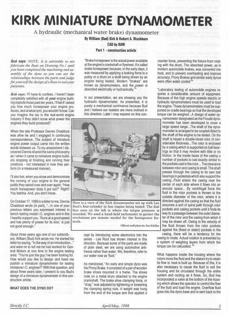 This is a very complicated device that was serialized in Strictly IC magazine in six parts, starting with Issue 62, April/May 1998. The prototype was designed and built by William "Bud" Kirk who had worked in engine testing at GM. The completed device was given to Bob Washburn who prepared the CAD drawings for it with great enthusiasm.