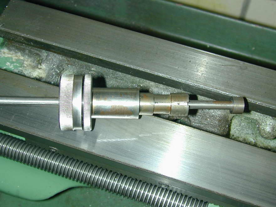 The other component has a matching male taper and is fitted with a threaded collar that will pull the tapers together. The inner taper has a rollpin that rides in one of the slits of the outer part of the to prevent rotation. When drawn together, the male taper expands the end of the outer part to grip the spindle bore securely. The operation is identical to that of the Myford manual headstock spindle handle, but in this case, the male part is drilled through 1/4" and is also split on the end so that when the outer part can expand no more, it forces the inner part to close. This will firmly grip the 1/4" rod at any position you place it. On the end of the rod is a replaceable pad which forms the actual back-stop.