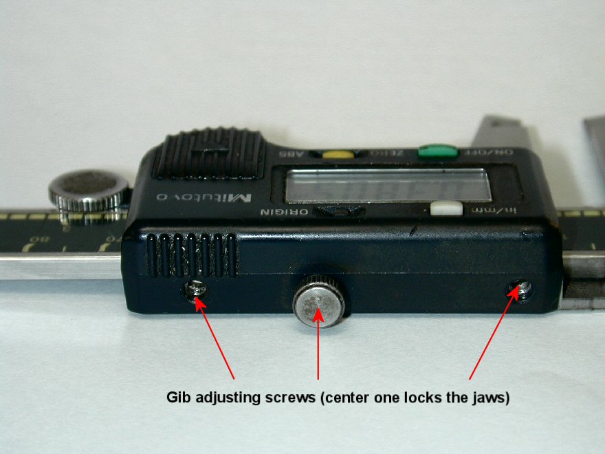 Like a lathe slide, the movable jaw of the Vernier caliper is fitted with an adjustable Gib strip. In the case of the Mitutoyo (and most instruments of this type), there are three Gib adjusting set screws, the central one being extended so it can be used to lock the head. It came as no surprise to me that upon applying a jewelers' screw driver to the front set screw, I found it so loose it was not contacting the Gib at all. The rear one was better, but still loose. Adjusting them so the movable jaw slides smoothly, but with a smidgen of "feel" cured the problem. The Vernier now reads the same as the Micrometer with moderate pressure. Applying excessive pressure moves the reading by 0.0005". I can live with that. I now observe a 0.0005" difference between the inside jaws and the depthing probe. I can live with that too.