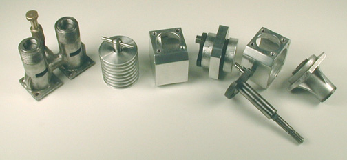 There was also an uncompleted opposed twin, 2.4cc, that was obviously made by the same fellow. It has a large "H" cast on top of each head, and is ringed with bronze rings. It was never finished completely. Rods are brass with tiny bolts holding on the caps. Again, nicely made. Both the twin and the single were fitted with 1/4 x 38 plug threads!