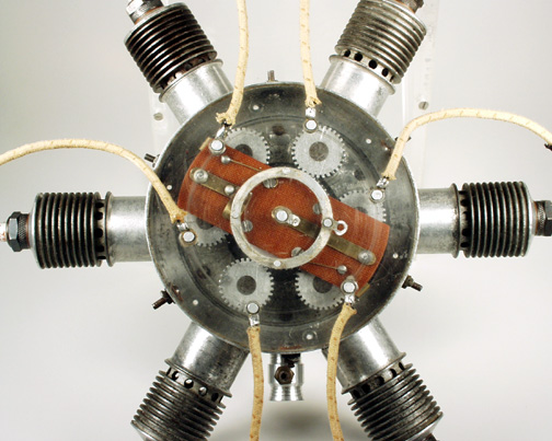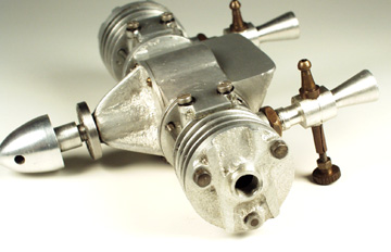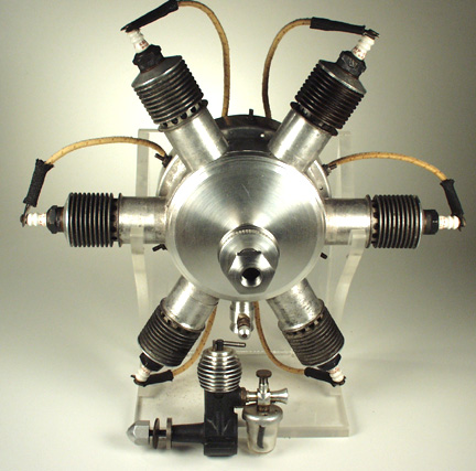 The single must truly be one of the very earliest RRV engines if these dates are correct. I did not know Jim McCann and I am sure he is the one who supplied the dates. From the sound of it, he must have personally known Mr McDonald. Maybe Ken or Ron Moulton can come up with more info on these engines and the gentleman that built them. I have no doubt that the single could have been developed into a good performing engine with a few modifications but you can bet it will stay the way it is as long as I have it! I can take better pics now if anyone wants more info. This is the one and only 6-cylinder M@M Radial. When I got the thing, the entire front plate was missing, the "wiper" in the distributor was missing and I had no idea how the damn thing worked. The crank is geared to half "engine" speed with soft aluminium gears that you can see in the shot of the distributor, with no means of lubricating them. The cylinder/piston assys were all used 1940 versions and the whole thing is really 6 separate engines, each with its own crankcase and reed intake. A very careful examination of the aluminium gears revealed a scratch mark on each and corresponding marks on the large output shaft gear. If all of these were lined up, it became clear that the engine operated as three Opposed twins, which in turn fired in a radial manner, ie; twin 1, then twin 2 and then twin 3.