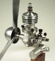 There were no points and no sign there had ever been a cam. There were, however, extra contacts in the distributor and I finally realized that the wiper also contacted the extra contacts as "points". There was also no indication of any way to mount the engine, and there was no good reason to use plexiglass in the rear of the timer. I concluded that this was a "proof of concept" engine, or maybe a "brag" engine for use at shows. It is mentioned in several collector's lists as having existed, and I got it from a very old ex employee and engineer that was with M@M when the doors where closed in 1940. If it had run, the soft aluminium gears would have probably failed on the first firing! Also, what in the world would you do with something like this in 1940? This is a BIG engine and would require electric starters that we did not have then. It is 1.8 cu. in. and with the prop running at half speed, I'm sure that it would require at least a 20" prop! I know the US guys have seen it, but I don't recall that any of you guys ever saw it in the MECA bulletin, so here are two