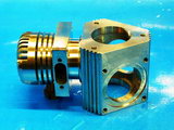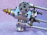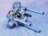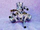 This is a big engine with a bore of 16.10mm and a stroke 16.35mm, giving a total swept volume of 9.98cc. It is fully machined from bar stock with no castings being used. Over all diameter is 132mm, and the length from mounting face to rear of prop is 108mm. The cylinder fins are 39mm dia. The 10mm dia exhaust pipes are 100mm long. The 3-point mounting system uses 6mm hex head cap screws. Overall mass is 954g. The engine is built around a triangulated crankcase.
