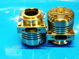 The cylinder sleeves are unhardened steel, whilst the very thin and lightweight baffled pistons appear to be hard-chromed. The finned alloy cylinder jackets have milled transfer passages and the cylinder sleeves feature simple loop-scavenged porting. Each cylinder assembly is fixed to the foundation crankcase with four long 8x32 screws. Each cylinder jacket has a tubular exhaust collector (fitted with two small screws) into which the long exhaust pipe is screwed with a very fine pitch thread. One exhaust collector is fitted with a pressure tap.