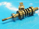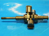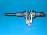 The front housing carries two ballraces and the rear housing one ballrace. In addition to supporting the rear of the crankshaft, the rear housing mounts the air-bleed throttle assembly. The long, one-piece, hardened and ground crankshaft is supported in three ballraces, the rear section of the shaft forming a crankshaft rotary valve. There are three throws at 120 degree spacing, giving simultaneous firing. The alloy conrods have split big-ends, the caps being retained by 1.5mm cap screws. The centre rod is symmetrical, whilst the front and rear rods have considerable offset at the little end. Tubular wrist pins with brass end pads are used.