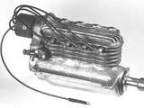 Details of yet another example appeared in the American Modeler Annual for 1965 [4]. This one was built by Mr WT Truenbach of Beaverton, OR (hey! I use to live there!) According to the article, WTT received yet another copy of the 42000 drawing as an unexpected gift with a set of M5 plans he ordered from the Morton company. Although only a hobby machinist, WTT set about producing his own patterns, castings and eventually at least two running M4's—the second from his second-rate casting, the first having being stolen. The photo shows what may be a camshaft fabricated by interspercing cam and bearing segments on a shaft, although it is possible that it was higged down from a single bar. Having the bearing segments larger in diameter than the cams is a practical way of supporting the cam shaft.