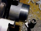 And here we are after the edge has been radiused. Care needs to be taken not to nick the top or side with the extreme ends of the tool by plunging in too far. Now use a parting off tool to cut down to the diameter of the portion that will insert into the bore (this can be seen clearly in the next shot). Use a right hand tool to ensire what will be the underside of the head has a good finish that is perpendicular to this section.